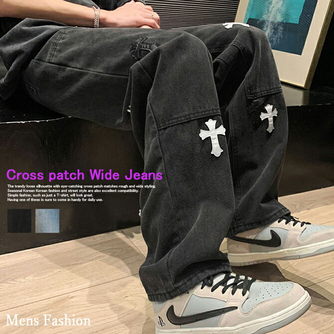 クロスパッチ ルーズストレートデニムパンツ ワイドデニム 十字架 ワッペン ジーンズ ジーパン バギーパンツ ストリート