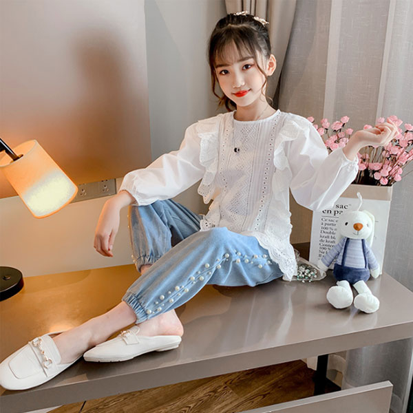 韓国子供服 セットアップ 女の子 春秋 新作 白ブラウス+ジーンズ スウィート カワイイ ジュニア服 学生 上下セット 女児用 長袖ブラウス 丸首 ルーズジーンズ オシャレ 普段着 通学着 110cm 120cm 130cm 140cm 150cm 160cm 子供服 女の子 セットアップ 春着 秋着
