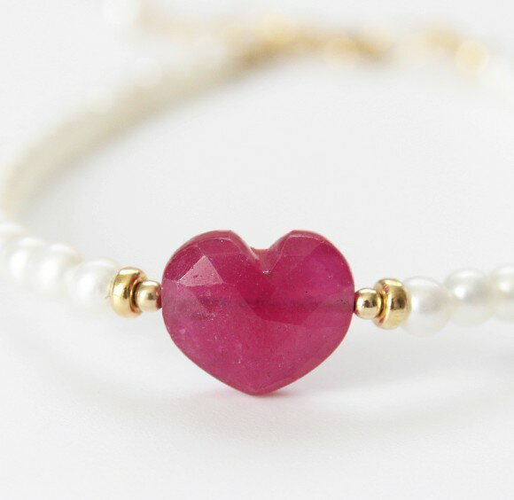 1点もの ルビー パール ブレスレット(ハートカット )14KGF 天然石 アクセサリー ゴールドフィルド ジュエリー ハンドメイド 淡水真珠 天然ルビー お守り レアカット 7月 誕生石