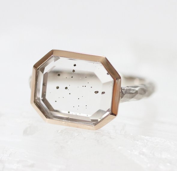 素材 K10・SV925(刻印あり) パイライトインクォーツ 約14×11,5ミリ前後 (枠込み) 4,45ct(刻印あり) サイズ 約13号 アーム幅 約2ミリ (艶消し・槌目加工) 長方形のポートレートカットがスタイリッシュな ブラジル産 パイライトインクォーツのリングです。 パイライトインクォーツは 水晶の中にパイライト(黄鉄鉱)を内包した珍しい鉱物になり マーカサイトインクォーツと似ていますが マーカサイトは薄い板状に対して パイライトはキューブ状や六面体、八面体など立体的な形をしており パイライトインクォーツの方が産出量が少なく希少です。 こちらは非常に透明度が高いクォーツに 微細なパイライトの結晶が美しく散っており チラチラと煌めきます。 パイライトインクォーツは 余計な不純物が入りやすい石なので クリアなルースには なかなか出会えません。 長方形を横に留めていますので 1本で指を覆うボリュームがある主役リングです。 タブレット状で 高さがないので 指になじみ 引っ掛かりもない覆輪留めなので つけ心地が良いです。 リング棒で測ると12号になりますが 楕円型のリングなので実質のつけ心地は13号くらいになります。 こちらは 日本の職人によって手作業で作られた1点ものになります。 ※ サイズ調整は 別途3800円にて承ります。(±3号まで) ご希望のサイズをご選択の上ご注文ください。(追加の金額が発生する場合は ご注文後に訂正いたします) 決済方法が「前払い」の場合はご入金確認後に加工となります。 納期に3週間ほどお時間をいただきます。 ※ こちらの商品は お箱に入れてお届けいたします。 ※ こちらは「宅配便」での発送になります。 「メール便」はご選択いただけません。 ※ 素材の説明、返品についてなど こちら に記載しております。 必ずご確認ください。