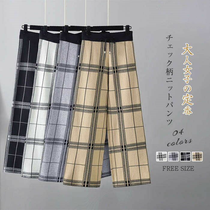 ニット ワイドパンツ レディース 秋冬 大人 可愛い ニットパンツ イージーパンツ ワイド パンツ ロングパンツ 秋 冬 春 リラックスパンツ ボトムス 重ね着 レイヤード チェック柄 体型カバー ウエストゴム 美脚 通勤 カジュアル 50代 40代 30代 グレー ブラック 黒
