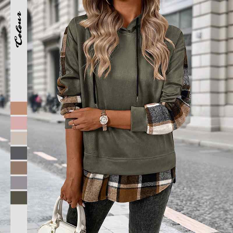 パーカー レディース 秋冬 カジュアル プルオーバー 長袖 连帽 スウェット トップス フェイクレイヤード チェック柄 切り替え 咖啡棕 ゆったり かわいい 日韓スタイル