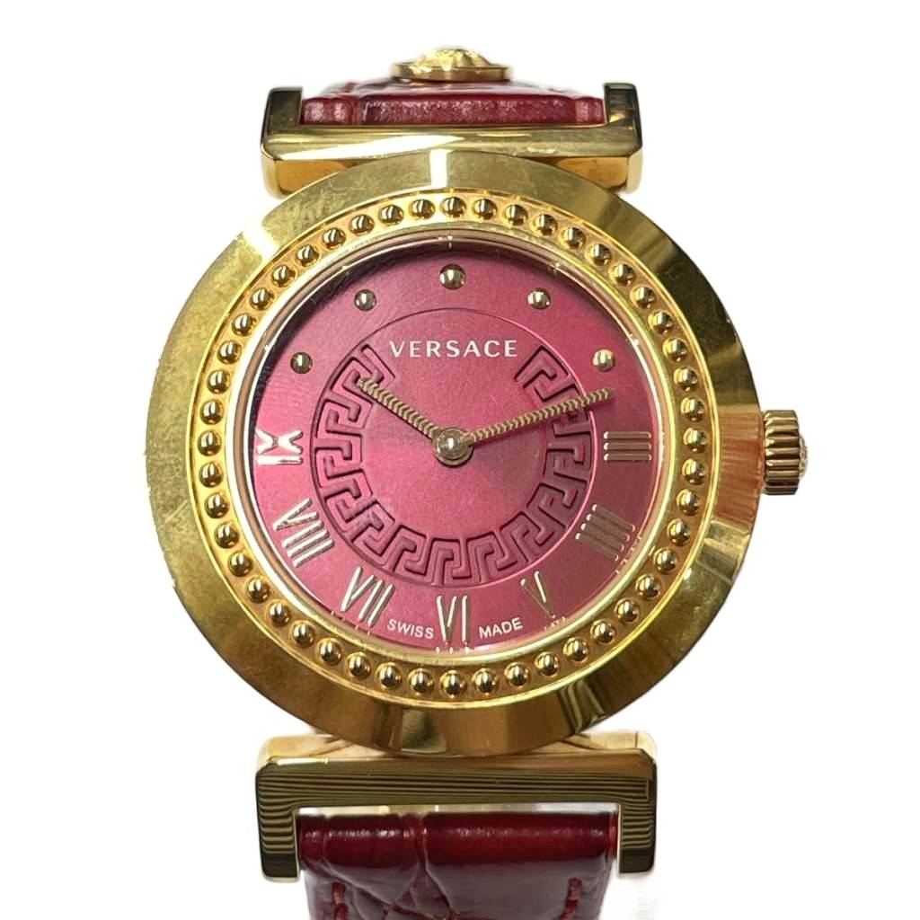 【中古】ヴェルサーチ ヴェルサーチェ VERSACE 腕時計 ウォッチ クォーツ式 アナログ 2針 メデューサ 文字盤レッド レザーベルト P5Q 051801501816 赤 ゴールド 稼働品 レディース 【ベクトル 古着】 250921