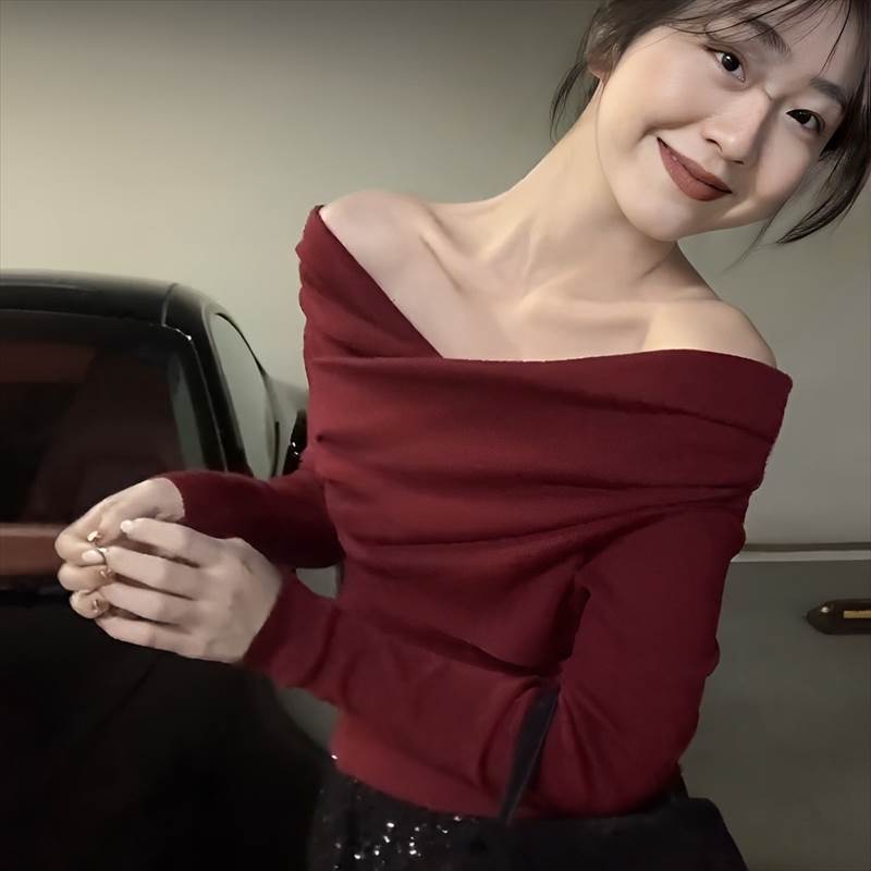 【P2倍&クーポン有】トップス ニット セーター 春 秋 冬 長袖 オフショルダー タイト 細身 レッド XS SS S M L XL LL イベント リゾート 旅行 高原 ホテル ガーデン コンサート ライブ 外遊び 体型カバー 日常使い 華奢見え 細見え 着痩せ 効果 若見え 高見え 合わせや