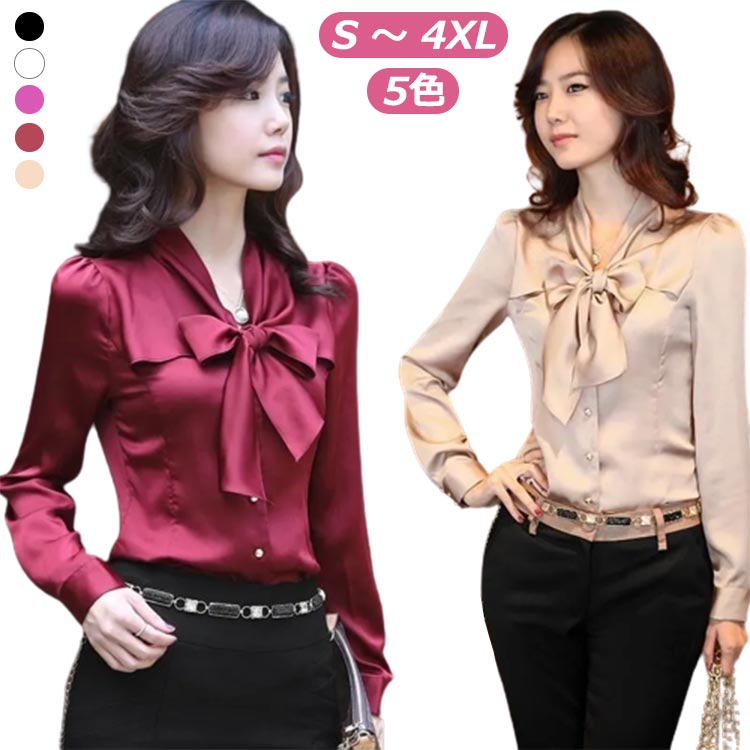 ブラウス シャツ ボウタイ 前開き 5色 長袖シャツ ビジネス OLオフィス フォーマル リクルート 就活 事務服 制服 きれいめ おしゃれ ホワイト 白 ブラック 黒 パープル 杏色 ワインレッド 無地 大きいサイズ S/M/L/LL/3L/4L