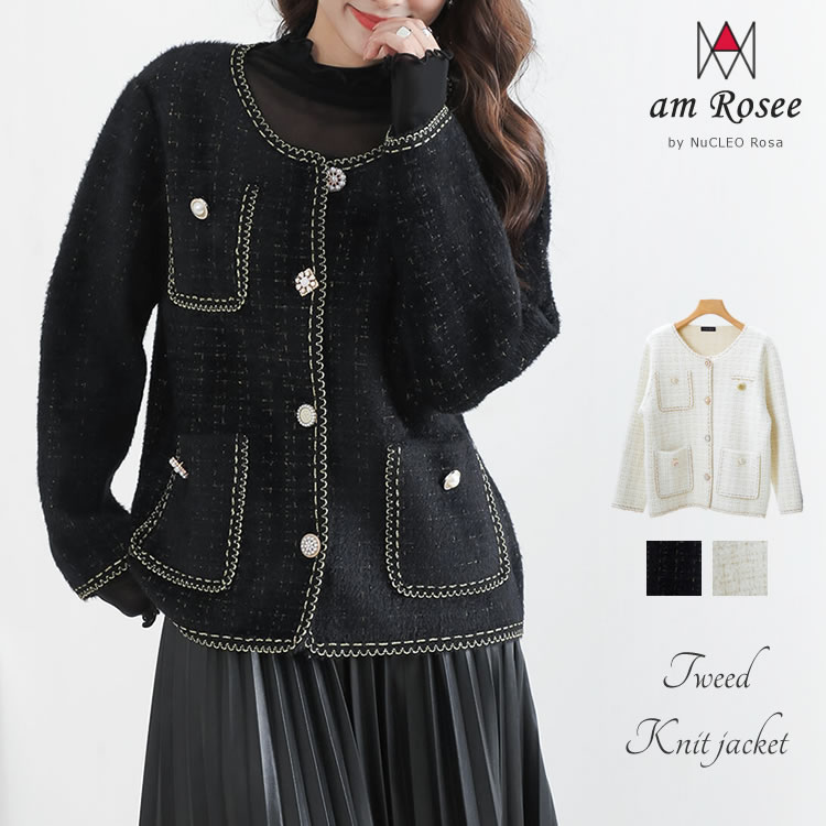 ツイード風ニットジャケット◆レディース ニット ジャケット カーディガン ツイード風 羽織 アウター 前開き ノーカラー 長袖 秋 冬 春 防寒 大人 上品 パール 40代 50代
