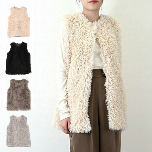 ベスト ボア ミドル丈 ノーカラー トップス レディース エクリュ グレー グレージュ ブラック