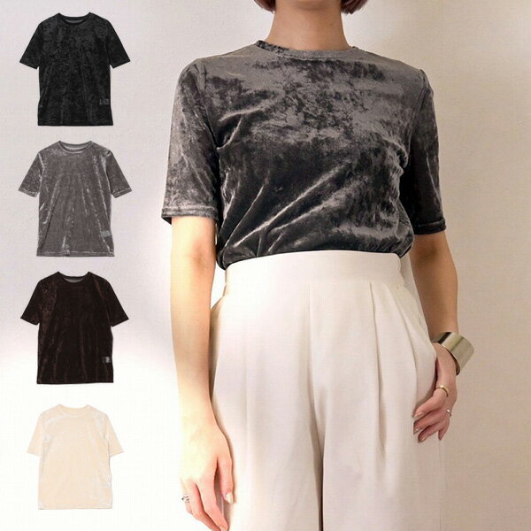 Tシャツ カットソー 半袖 シアー ベロア 無地 クルーネック トップス レディース エクリュ グレー ブラウン ブラック