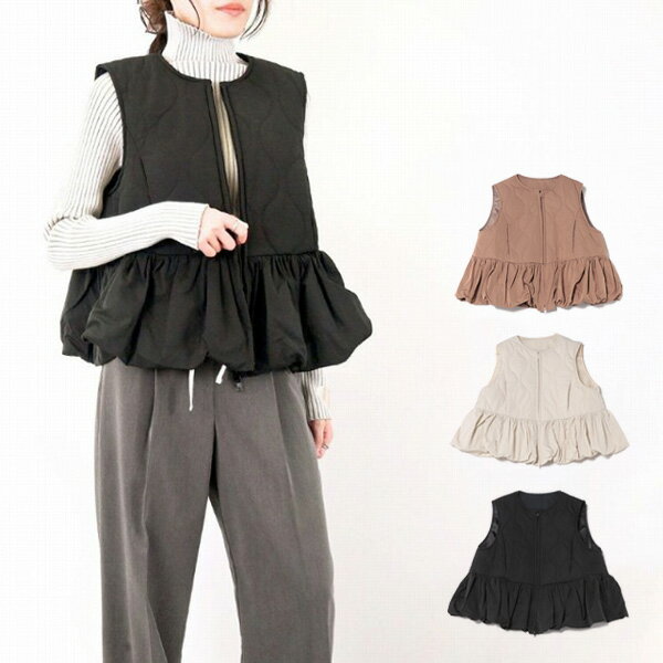 【取り寄せ対応】ベスト ペプラム キルティング 中綿ベスト 前開き ノーカラー ジップアップ アウター レディース エクリュ モカ ブラック