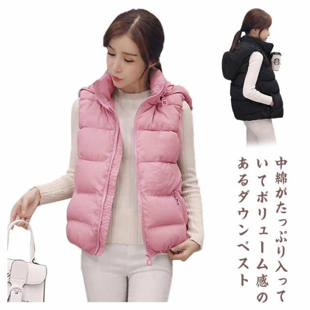 中綿ベスト レディース あったか 立ち襟 取り外し可能 フード付き 防風 軽量 スリム ノースリーブ 暖か 部屋着 痩せ着 アウター 防寒着 秋冬 通勤 無地 シンプル 大きいサイズ