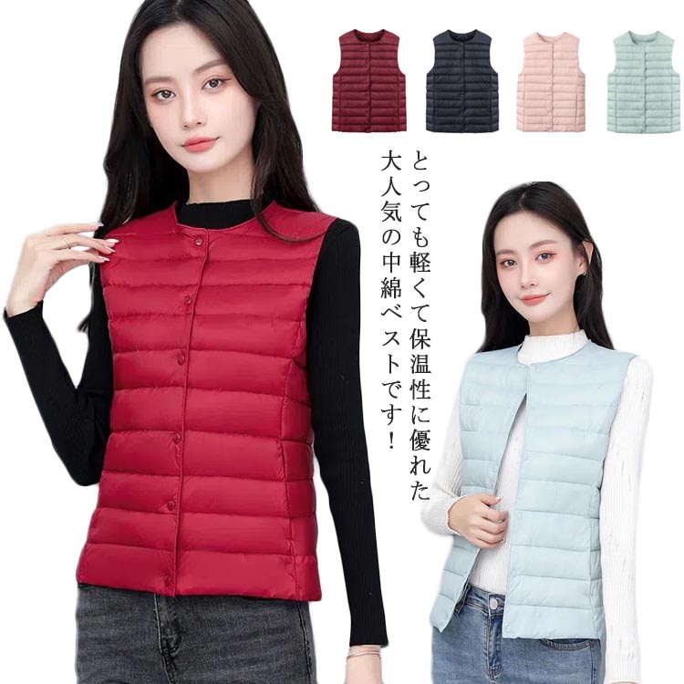 中綿ベスト レディース アウター ジレ 秋冬 あったか 防寒 トップス 前開き 大きいサイズ カジュアル 羽織り ノースリーブ クルーネック 暖かい 軽量 シンプル 普段着 無地 20代 30代 40代 送料無料