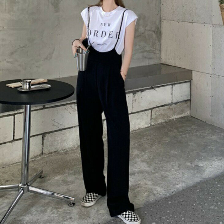 ハイウエスト ストラップ ワイドレッグパンツ バギーパンツ ワイドパンツ サロペット レトロパンツ ワイドレッグ ストラップワイドパンツ 無地 シンプル 大人 オフィス 上品 レディース OL お出かけ ins デート 韓国 トレンド ママ