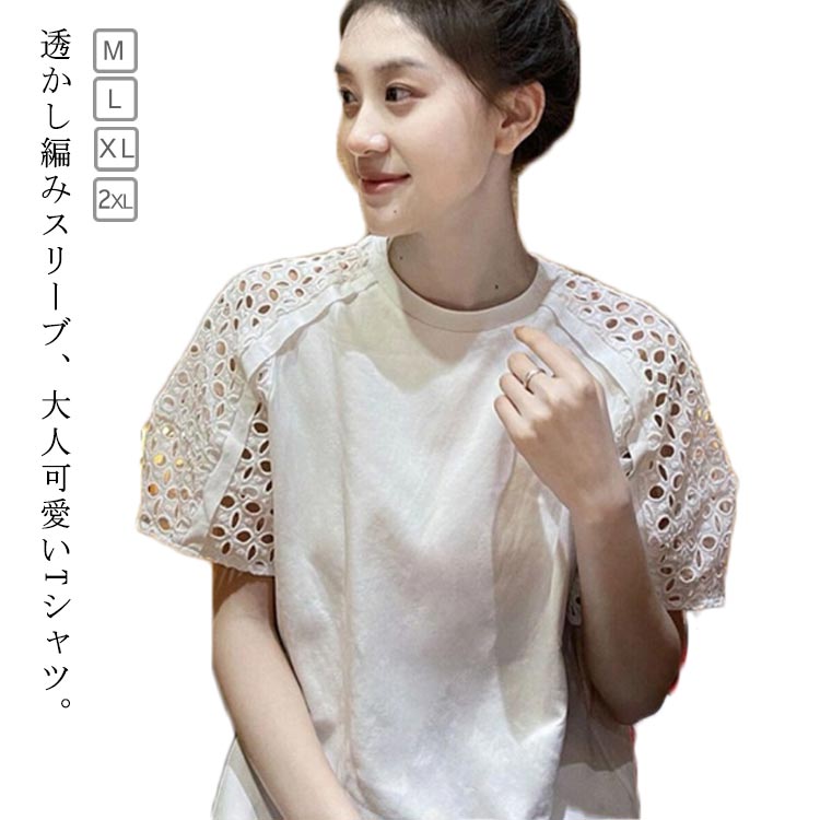 透かし編み袖 Tシャツ レディース 半袖 半袖tシャツ カットソー 春夏 トップス 切り替えTシャツ カジュアル おしゃれ フェミニン きれいめ レトロ ビンテージ M L XL 2XL