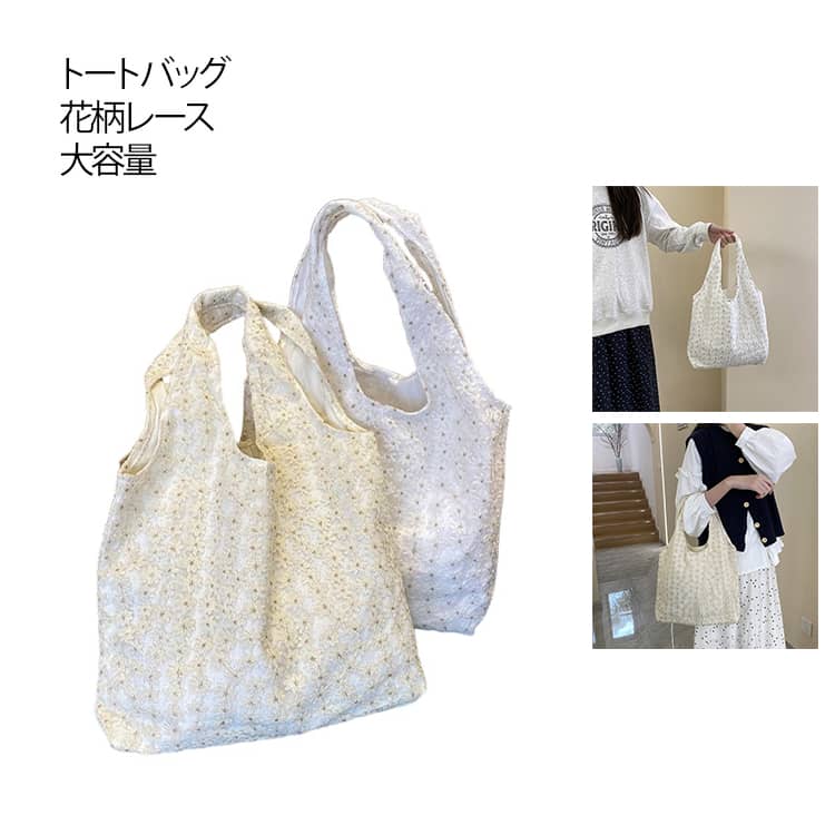 ■甘くてレトロな花柄レース A4対応大容量 レディーストートバッグ 収納力抜群、レディーストートバッグが新入荷 手提げと肩掛け両方でき、程よい長さのベルト サイズ的にはA4対応可能、テキストブック?ファイル?雑誌なども気軽に収納 ベルトの設計は幅広めで、肩への食い込みが軽減 あらゆるコーデに馴染みやすいカジュアルなデザイン エレガントな花柄レースが贅沢に使われ、さりげなく女度まし 清潔感のホワイト&優しいベージュの2色を用意 通勤?旅行?デート?ショッピングなど、幅広い場合で活躍できます