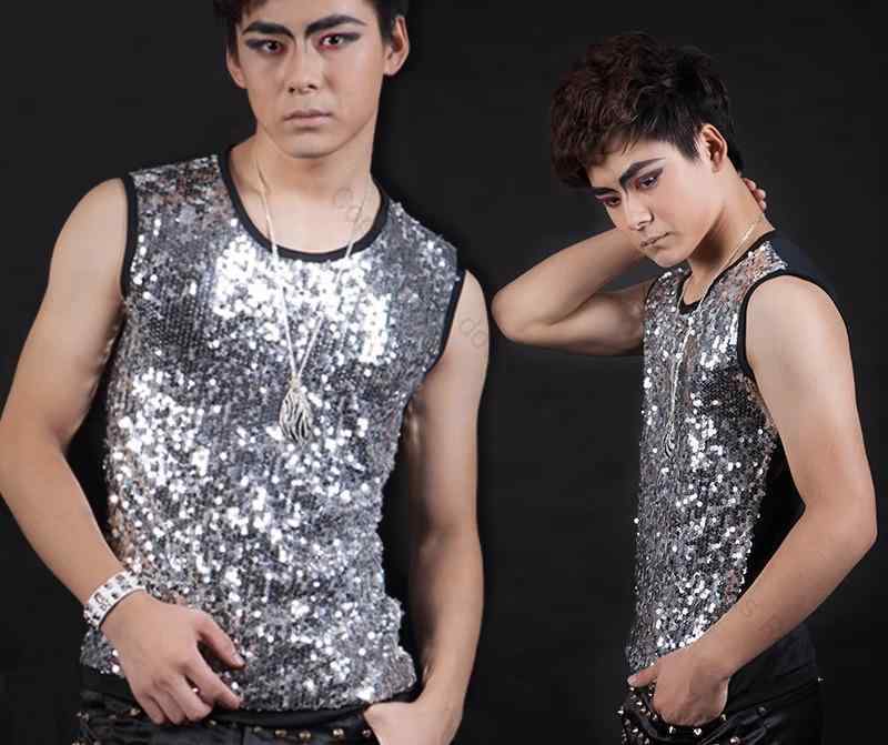タンクトップ メンズ ノースリーブ 男性用 歌手 ロック パンク スリムシルエット パフォーマンス 舞台 ステージ 衣装 ダンス 夏用 スパンコール ラウンドネック プルオーバー 派手 大きいサイズ対応 黒 銀 白カラー展開