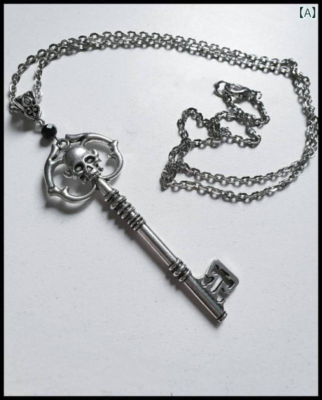 ネックレス メンズ レディース ユニセックス ゴシック アンティーク シルバー スカル キー クリスタル ペンダント ロック パンク スタイル アクセサリー 合金製 電気メッキ加工 クロスチェーン