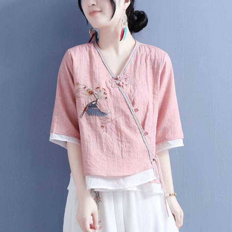 ファッション 服 オシャレ カワイイ シンプル 大カワイイ サイズ 婦服 夏 コットンリネン フライング バード Vネック 斜 ビーズ ボタン ミッド スリーブ トップス リネン レトロ ティー ドレス シャツ