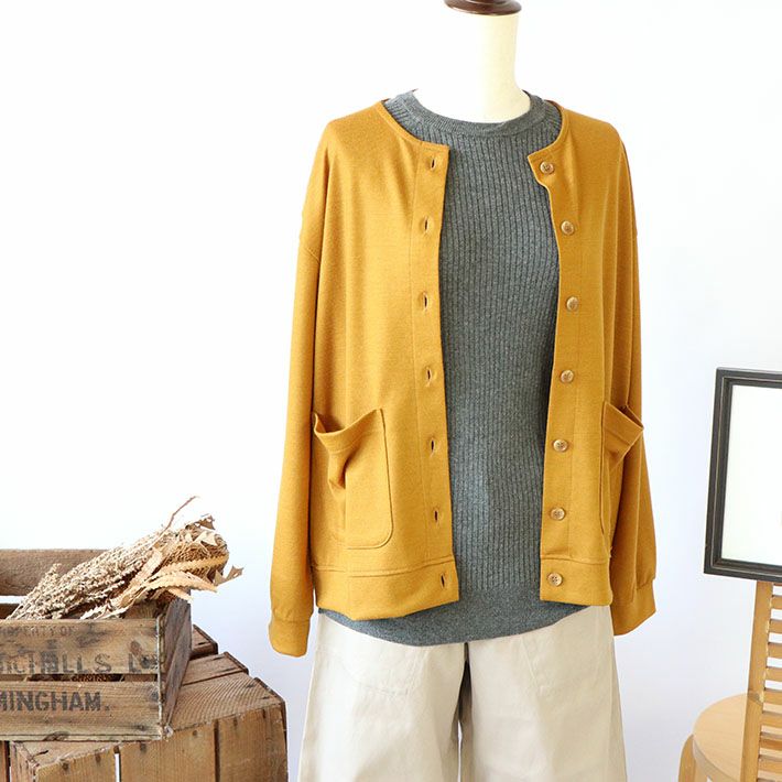 商品情報素材/材質毛 100%サイズ/寸法着丈 60.5cm 肩幅 48cmバスト 104cm 袖丈 53cm 袖口幅 11.5cm 裾周り 96cm上記寸法は実寸です。(平置き)その他商品説明日本製*手洗い可能注意モニター発色の具合により色合いが異なる場合がございます。[rolca on the notes]ウール天竺オーバーカーディガン マスタード ロルカ おうちで洗えるウール100%カットソー、「rolca on the notes(ロルカオンザノーツ)」のカーディガンです。 太番手のウール糸を縮絨加工することで、適度な肉感とハリを表現。滑らかな肌触りと光沢感があり、ウールのチクチク感もほとんど感じない上品な仕上がりです。シンプルなクルーネックカーディガン。身幅をややオーバーサイズに仕立て、ゆったりしたインナーの上からも羽織りやすいサイズ感です。袖口はカフス風に切り替えて、ギャザーを入れふんわりとしたデザインに。生地がしなやかなので、腕周りにもしっくりと馴染みます。裾周りにも広幅に切り替えを付け、引き締まった印象に。ブルゾンのような感覚でいて、生地の光沢や滑らかさが上品さも併せ持つ、オンオフ問わず着られるアイテムです。同じ素材のカーディガン「ウール天竺ハイネックプルオーバー」とセットアップで着ていただけます。 5