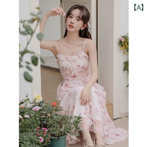 レディース ワンピース 魅惑的 スリム V ネック 花柄 フリル プリント ロング スカート 不規則 シーサイドリゾート サスペンダー ドレス
