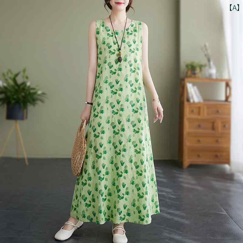 レディース 夏 ワンピース ビーチ リゾート サマードレス 大きめ サイズ 文学 女性 グリーン クリスタル プリントノースリーブ 薄手 綿 リネン ベスト ドレス ロング スカート