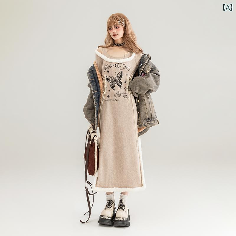 レディース ビッグ Uネック ニット ワンピース 秋冬 ガール プリント スリムフィット ヒップライン ロング スカート スリット バタフライ デート