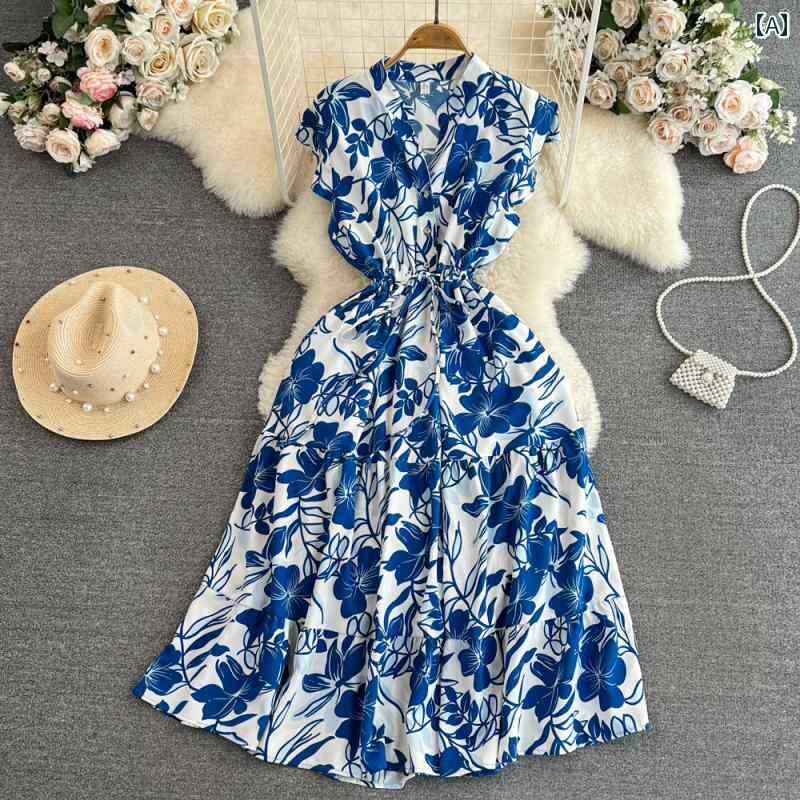 レディース ワンピース ハイエンド 軽量 フライング スリーブ V ネック ウエスト 細く a ライン フリル プリント ドレス エレガント ロング スカート
