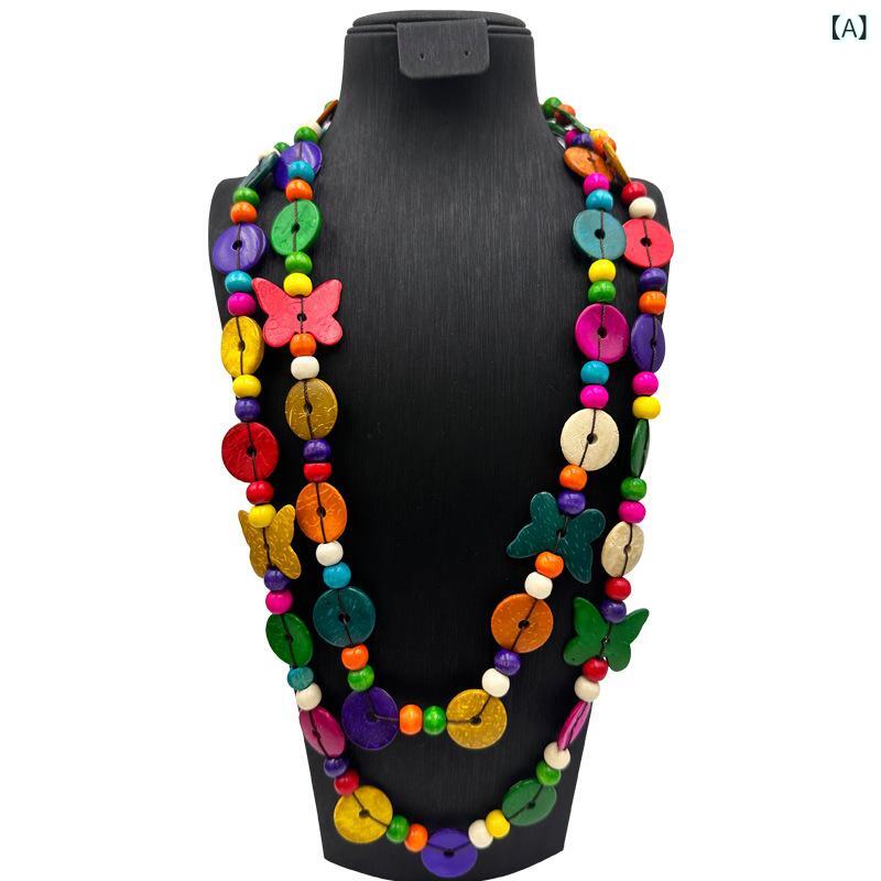 ネックレス レディース レトロ カラフル ボヘミアン 民族風 ハンドメイド ビーズ 多連 ココナッツ ウッド ロングネックレス フラワーモチーフ