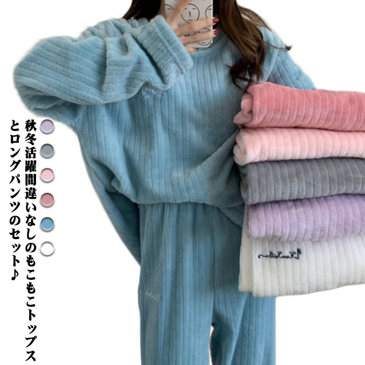 ルームウェア パジャマ モコモコ セットアップ 上下セット ロングパンツ 大人 レディース 女性用 ラウンドネック 長ズボン ゆったり 可愛い 韓国 暖かい ルームウェア 秋冬 部屋着 お洒落 送料無料