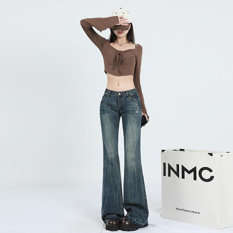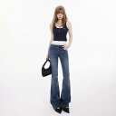 デニム レディース ローライズ ブーツカット ジーンズ 韓国風 レトロ ダメージ加工 ジーパン Gパン ボトムス パンツ ポリエステル 綿 美脚 脚長 ズボン ゆったり ワイド 薄手 春秋