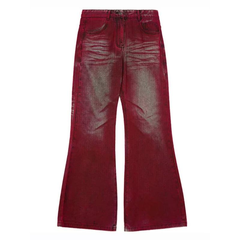 デニム レディース レッド ローライズ ブーツカット ジーパン ワイドレッグ ロングパンツ ゆったり ストリート カジュアル