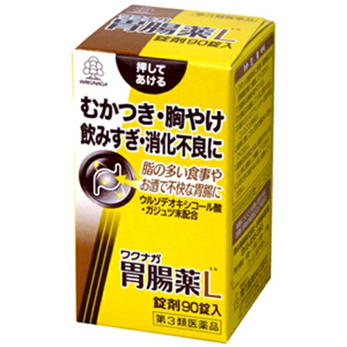 使用上の注意 ●相談すること1.次の人は服用前に医師、薬剤師又は登録販売者に相談してください。(1)医師の治療を受けている人(2)妊婦又は妊娠していると思われる人(3)薬などによりアレルギー症状を起こしたことがある人2.服用後、次の症状があらわれた場合は副作用の可能性がありますので、直ちに服用を中止し、この説明文書を持って医師、薬剤師又は登録販売者に相談してください。関係部位症状皮膚発疹・発赤、かゆみ3.2週間位服用しても症状がよくならない場合は服用を中止し、この説明文書を持って医師、薬剤師又は登録販売者に相談してください 効能・効果 はきけ(むかつき、胃のむかつき、二日酔・悪酔のむかつき、嘔気、悪心)、胸やけ、飲みすぎ、消化不良、食べすぎ、消化促進、胃部・腹部膨満感、もたれ、食欲不振、胸つかえ、胃弱、嘔吐 成分・分量 成分分量(9錠中)はたらき ウルソデオキシコール酸60mg肝・胆道系に作用して、胆汁の生成・分泌を促し、脂肪やビタミンなどの消化吸収を助けます。 カルニチン塩化物300mg胃液の分泌を促進し、弱った胃の働きを高め、食欲不振を改善します。 アセンヤク末200mg腸の機能を整えます。 ガジュツ末300mg芳香性の健胃生薬で、腹部膨満感を取りのぞきます。 ビオヂアスターゼ1000150mg炭水化物・たんぱく質・脂肪を消化し、胃腸の働きを補います。 リパーゼAP660mg添加物として、乳糖、ヒドロキシプロピルセルロース、無水ケイ酸、リン酸水素Ca、カルメロースCa、カラメル、ステアリン酸Mgを含有します。 用法・用量 1回下記量を食後に水又はお湯と一緒に服用してください。 年齢1回量1日服用回数 大人(15才以上)3錠3回 11才以上15才未満2錠 11才未満服用させないでください●用法・用量に関する注意(1)小児に服用させる場合には、保護者の指導監督のもとに服用させてください。 保管上の注意 (1)直射日光の当たらない湿気の少ない涼しい所に密栓して保管してください。(2)小児の手の届かない所に保管してください。(3)他の容器に入れ替えないでください。(誤用の原因になったり品質が変わります。)(4)使用期限を過ぎた製品は服用しないでください。(5)ビンの詰め物は、輸送中の内容物の破損を防ぐためのものです。開封後は不要となりますので、取りのぞいてください。●ワンポイント情報私たちは日常、食生活の不摂生やストレスなどの結果として、胃腸の不快な症状を感じることがあります。しかし、同じ症状、例えば、もたれやむかつきなどを感じた時でも、体の状態により適した胃腸薬は異なる場合があります。消化液(胃酸など)の分泌は過剰か、あるいは不足ぎみか、胃腸の運動機能は活発か、あるいは衰えている感じか、などは状態の違いの一例です。配合されている成分の働きを知って、自分の症状に適した胃腸薬を選択すれば効果的に症状の改善ができます。ご自分にあった胃腸薬がよくわからないという方は、薬剤師など専門家にご相談の上、お選びになることをおすすめします。 商品区分 第三類医薬品 文責者 森田雄喜 登録販売者 製造販売元 販売元 湧永製薬株式会社 広島県安芸高田市甲田町下甲立1624本社:大阪市淀川区宮原4丁目5-36 製造販売元 湧永製薬株式会社br> 広島県安芸高田市甲田町下甲立1624本社:大阪市淀川区宮原4丁目5-36 お問い合わせ先 湧永製薬株式会社 お客様相談室 〒101-0062 東京都千代田区神田駿河台2丁目5-1 電話:03-3293-3363 第三類医薬品とは日常生活に支障をきたす程度ではないが、身体の変調・不調が起こるおそれがある成分を含むもの。 (例)ビタミンB、C含有保健薬、整腸剤など「ワクナガ胃腸薬L 90錠」は、熊胆(ユウタン)中の有効成分、ウルソデオキシコール酸をはじめ、健胃・整腸生薬、消化酵素など計6種の成分を配合した胃腸薬で、むかつき、胸やけなどの不快な症状を改善します。脂の多い食事や、お酒が原因で疲れた胃腸の働きを助けます【医薬品販売に関する記載事項】(必須記載事項)はこちら