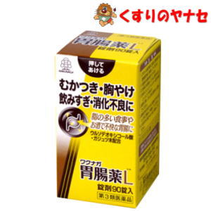 使用上の注意 ●相談すること1.次の人は服用前に医師、薬剤師又は登録販売者に相談してください。(1)医師の治療を受けている人(2)妊婦又は妊娠していると思われる人(3)薬などによりアレルギー症状を起こしたことがある人2.服用後、次の症状があらわれた場合は副作用の可能性がありますので、直ちに服用を中止し、この説明文書を持って医師、薬剤師又は登録販売者に相談してください。関係部位症状皮膚発疹・発赤、かゆみ3.2週間位服用しても症状がよくならない場合は服用を中止し、この説明文書を持って医師、薬剤師又は登録販売者に相談してください 効能・効果 はきけ(むかつき、胃のむかつき、二日酔・悪酔のむかつき、嘔気、悪心)、胸やけ、飲みすぎ、消化不良、食べすぎ、消化促進、胃部・腹部膨満感、もたれ、食欲不振、胸つかえ、胃弱、嘔吐 成分・分量 成分分量(9錠中)はたらき ウルソデオキシコール酸60mg肝・胆道系に作用して、胆汁の生成・分泌を促し、脂肪やビタミンなどの消化吸収を助けます。 カルニチン塩化物300mg胃液の分泌を促進し、弱った胃の働きを高め、食欲不振を改善します。 アセンヤク末200mg腸の機能を整えます。 ガジュツ末300mg芳香性の健胃生薬で、腹部膨満感を取りのぞきます。 ビオヂアスターゼ1000150mg炭水化物・たんぱく質・脂肪を消化し、胃腸の働きを補います。 リパーゼAP660mg添加物として、乳糖、ヒドロキシプロピルセルロース、無水ケイ酸、リン酸水素Ca、カルメロースCa、カラメル、ステアリン酸Mgを含有します。 用法・用量 1回下記量を食後に水又はお湯と一緒に服用してください。 年齢1回量1日服用回数 大人(15才以上)3錠3回 11才以上15才未満2錠 11才未満服用させないでください●用法・用量に関する注意(1)小児に服用させる場合には、保護者の指導監督のもとに服用させてください。 保管上の注意 (1)直射日光の当たらない湿気の少ない涼しい所に密栓して保管してください。(2)小児の手の届かない所に保管してください。(3)他の容器に入れ替えないでください。(誤用の原因になったり品質が変わります。)(4)使用期限を過ぎた製品は服用しないでください。(5)ビンの詰め物は、輸送中の内容物の破損を防ぐためのものです。開封後は不要となりますので、取りのぞいてください。●ワンポイント情報私たちは日常、食生活の不摂生やストレスなどの結果として、胃腸の不快な症状を感じることがあります。しかし、同じ症状、例えば、もたれやむかつきなどを感じた時でも、体の状態により適した胃腸薬は異なる場合があります。消化液(胃酸など)の分泌は過剰か、あるいは不足ぎみか、胃腸の運動機能は活発か、あるいは衰えている感じか、などは状態の違いの一例です。配合されている成分の働きを知って、自分の症状に適した胃腸薬を選択すれば効果的に症状の改善ができます。ご自分にあった胃腸薬がよくわからないという方は、薬剤師など専門家にご相談の上、お選びになることをおすすめします。 商品区分 第三類医薬品 文責者 森田雄喜 登録販売者 製造販売元 販売元 湧永製薬株式会社 広島県安芸高田市甲田町下甲立1624本社:大阪市淀川区宮原4丁目5-36 製造販売元 湧永製薬株式会社br> 広島県安芸高田市甲田町下甲立1624本社:大阪市淀川区宮原4丁目5-36 お問い合わせ先 湧永製薬株式会社 お客様相談室 〒101-0062 東京都千代田区神田駿河台2丁目5-1 電話:03-3293-3363 第三類医薬品とは日常生活に支障をきたす程度ではないが、身体の変調・不調が起こるおそれがある成分を含むもの。 (例)ビタミンB、C含有保健薬、整腸剤など「ワクナガ胃腸薬L 90錠」は、熊胆(ユウタン)中の有効成分、ウルソデオキシコール酸をはじめ、健胃・整腸生薬、消化酵素など計6種の成分を配合した胃腸薬で、むかつき、胸やけなどの不快な症状を改善します。脂の多い食事や、お酒が原因で疲れた胃腸の働きを助けます【医薬品販売に関する記載事項】(必須記載事項)はこちら