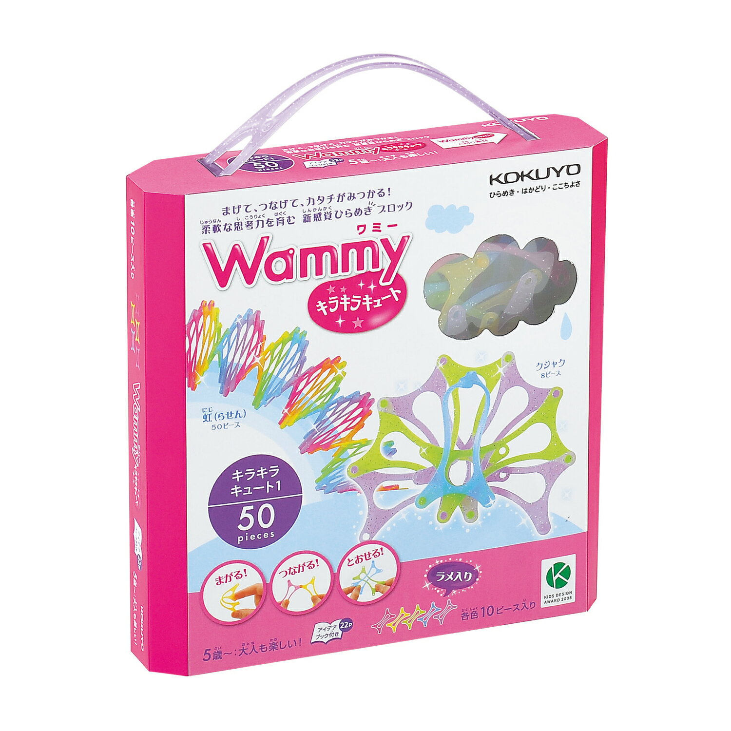 \コクヨの絵本・知育シリーズで使える250円OFFクーポン配布中/ ▲タップしてLINE友だち登録する ≫クーポンの対象商品一覧はこちら≪ まげて、つなげて、カタチが見つかる。柔軟な思考力を育む新感覚ひらめきブロック。キラキララメ入り。 Wammy(ワミー)は、曲げたり通したり、さまざまなつなぎ方ができる、新感覚のブロックです。 女の子が大好きなラメ入りで、アクセサリーなどを作るのにピッタリです。 ピースがやわらかいため、曲げたり間を通したりしながら様々なつなぎ方ができます。 たった1つのピースからアイデア次第で次々に新しい形を作り出すことができます。 ワミーシリーズは第2回キッズデザイン賞受賞商品です。 ・キラキラキュート1(50ピース) ラメ入りのクリアカラー5色50ピース ピースの色:ピンク・きいろ・みどり・あお・むらさき 22ページのアイデアブック付き ・キラキラキュート2(120ピース) ラメ入りのクリアカラー6色120ピース ピースの色:ピンク・オレンジ・きいろ・みどり・あお・むらさき 22ページのアイデアブック付き ・キラキラキュートDX(200ピース) ラメ入りのクリアカラー8色200ピース ピースの色:ピンク・しろ・むらさき・あか・オレンジ・きいろ・みどり・あお キラキラシール×4枚(2種類×2枚) 30ページのアイデアブック付き 【テーマ】 【考えて作るブロック玩具】 考えて作るブロック玩具 メイキングトイ 身に着けられる 5歳 6歳 7歳 【用途】 知育 想像力 創造力 認知力 洞察力 思考力 集中力 育成 知育玩具 知育絵本 知育画材 玩具 絵本 画材 おもちゃ えほん がざい 読み聞かせ お絵描き おえかき ぬりえ 塗り絵 工作 創作 一人遊び ひとりあそび おうち時間 おうちじかん おうち遊び おうちあそび ギフト プレゼント 贈り物 記念品 おみやげ お土産 お年玉 男の子 おとこのこ 女の子 おんなのこ キッズ 子ども 子供 こども お正月 入園 入学 卒園 梅雨 帰省 移動 Halloween ハロウィン Xmas クリスマス Christmas 誕生日 バースデー 出産 ホームパーティ 幼稚園 保育園 児童館 キッズスペース 日本製 安心 安全まげて、つなげて、カタチが見つかる。柔軟な思考力を育む新感覚ひらめきブロック。 Wammy(ワミー)は、曲げたり通したり、さまざまなつなぎ方ができる、新感覚のブロックです。