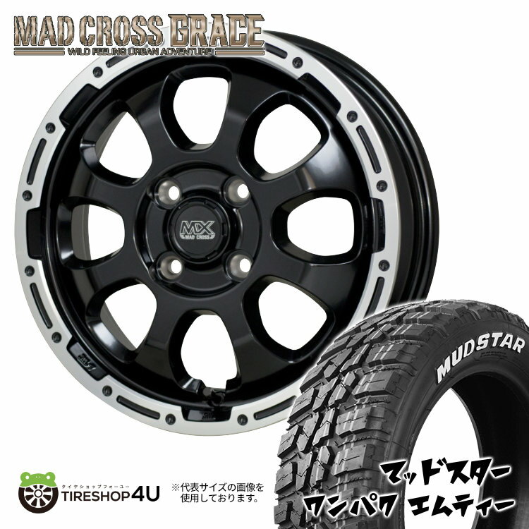 MAD CROSS GRACE 14x4.5J 4/100 +45 セミグロスブラック リムポリッシュ MUDSTAR WANPAKU M/T 155/65R14 ホワイトレター 軽自動車 N-BOX スペーシアギア EKクロス 軽ワゴンなど新品 タイヤホイール4本セット マッドクロス マッドスター ワンパク MT