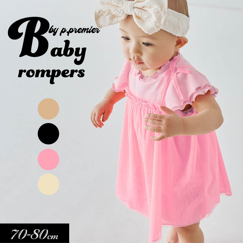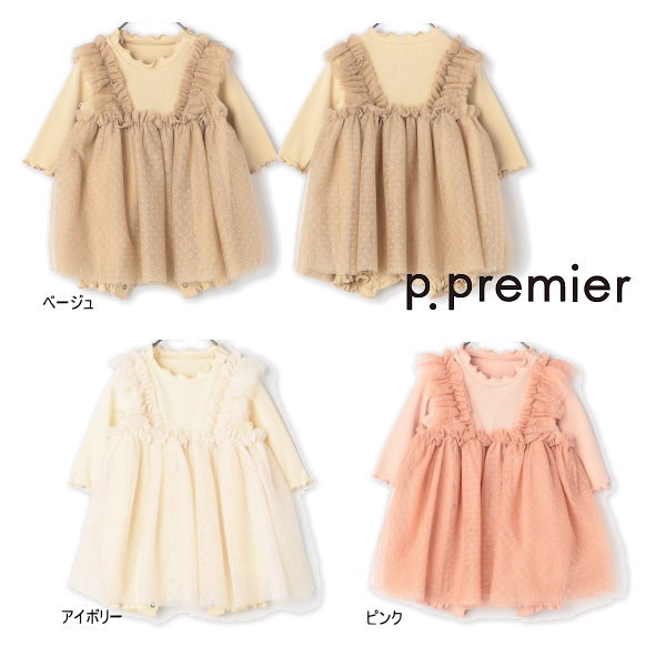 【10%off SALE】【p.premierピードットプルミエ】P432035◇ドットチュールフリルワンピロンパース◇チュールのビスチェを重ね着したようなデザインがかわいい♪綿素材でお肌にも優しく、ストレッチが効いているので着脱しやすいです♪【ベビー&キッズ服】◎メール便可