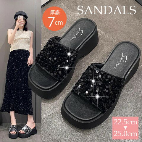 ■コメント・足元が華やかになるスパンコールサンダル。・歩く度に光に反射しキラキラと輝きとても綺麗です。・脱ぎ履きしやすいデザイン。・厚底ながらウエッジソールで安定した履き心地。・7cmの厚底ソールで、履くだけでスタイルアップできます。・耐摩耗性&滑り止めアウトソールで安心安全。■サイズ(単位:cm)22.5cm(35)、23.0cm(36)、23.5cm(37)、24.0cm(38)、24.5cm(39)、25.0cm(40)■ヒール高さ約6cm■カラー画像に記載■主素材合成皮革、合成底
