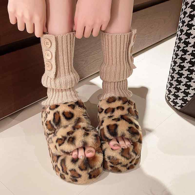 ファーサンダル レディース 厚底 シークレットヒール ヒョウ柄 もこもこ ふわふわ 暖か 防寒 外履き 室内履き ルームシューズ 秋冬用 オープントゥ スタイルアップ 美脚効果 PVCソール 快適クッション