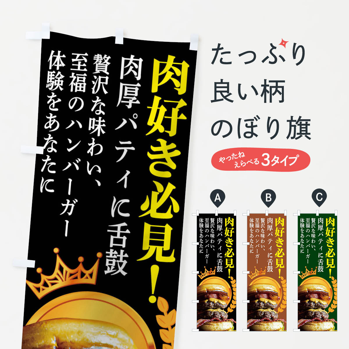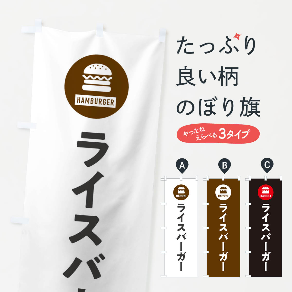 グッズプロののぼり旗は「節約じょうずのぼり」から「セレブのぼり」まで細かく調整できちゃいます。のぼり旗にひと味加えて特別仕様に一部を変えたい店名、社名を入れたいもっと大きくしたい丈夫にしたい長持ちさせたい防炎加工両面別柄にしたい飾り方も選べます壁に吊るしたい全面柄で目立ちたい紐で吊りたいピンと張りたいチチ色を変えたいちょっとおしゃれに看板のようにしたいバーガーのぼり旗、他にもあります。【ネコポス送料360】 のぼり旗 クラフトバーガー・ハンバーガーのぼり 4N76 内容・記載の文字(クラフトバーガー・ハンバーガー)印刷自社生産 フルカラーダイレクト印刷またはシルク印刷デザイン【A】【B】【C】からお選びください。※モニターの発色によって実際のものと色が異なる場合があります。名入れ、デザイン変更(セミオーダー)などのデザイン変更が気楽にできます。以下から別途お求めください。サイズサイズの詳細については上の説明画像を御覧ください。ジャンボにしたいのぼり重量約80g素材のぼり生地:ポンジ(テトロンポンジ)一般的なのぼり旗の生地通常の薄いのぼり生地より裏抜けが減りますがとてもファンが多い良い生地です。おすすめA1ポスター:光沢紙(コート紙)チチチチとはのぼり旗にポールを通す輪っかのことです。のぼり旗が裏返ってしまうことが多い場合は右チチを試してみてください。季節により風向きが変わる場合もあります。チチの色変え※吊り下げ旗をご希望の場合はチチ無しを選択してください対応のぼりポール一般的なポールで使用できます。ポールサイズ例:最大全長3m、直径2.2cmまたは2.5cm※ポールは別売りです ポール3mのぼり包装1枚ずつ個別包装 PE袋(ポリエチレン)包装時サイズ:約20x25cm横幕に変更横幕の画像確認をご希望の場合は、決済時の備考欄に デザイン確認希望 とお書き下さい。※横幕をご希望でチチの選択がない場合は上のみのチチとなります。ご注意下さい。のぼり補強縫製見た目の美しい四辺ヒートカット仕様。ハトメ加工をご希望の場合はこちらから別途必要枚数分お求め下さい。三辺補強縫製 四辺補強縫製 棒袋縫い加工のぼり防炎加工特殊な加工のため制作にプラス2日ほどいただきます。防炎にしたい・商標権により保護されている単語ののぼり旗は、使用者が該当の商標の使用を認められている場合に限り設置できます。・設置により誤解が生じる可能性のある場合は使用できません。(使用不可な例 : AEDがないのにAEDのぼりを設置)・裏からもくっきり見せるため、風にはためくために開発された、とても薄い生地で出来ています。・屋外の使用は色あせや裁断面のほつれなどの寿命は3ヶ月〜6ヶ月です。※使用状況により異なり、屋内なら何年も持ったりします。・雨風が強い日に表に出すと寿命が縮まります。・濡れても大丈夫ですが、中途半端に濡れた状態でしまうと濡れた場所と乾いている場所に色ムラが出来る場合があります。・濡れた状態で壁などに長時間触れていると色移りをすることがあります。・通行人の目がなれる頃(3ヶ月程度)で違う色やデザインに替えるなどのローテーションをすると効果的です。・特別な事情がない限り夜間は店内にしまうなどの対応が望ましいです。・洗濯やアイロン可能ですが、扱い方により寿命に影響が出る場合があります。※オススメはしません自己責任でお願いいたします。色落ち、色移りにご注意ください。商品コード : 4N76問い合わせ時にグッズプロ楽天市場店であることと、商品コードをお伝え頂きますとスムーズです。改造・加工など、決済備考欄で商品を指定する場合は上の商品コードをお書きください。ABC【ネコポス送料360】 のぼり旗 クラフトバーガー・ハンバーガーのぼり 4N76 安心ののぼり旗ブランド 「グッズプロ」が制作する、おしゃれですばらしい発色ののぼり旗。デザインを3色展開することで、カラフルに揃えたり、2色を交互にポンポンと並べて楽しさを演出できます。文字を変えたり、名入れをしたりすることで、既製品とは一味違う特別なのぼり旗にできます。 裏面の発色にもこだわった美しいのぼり旗です。のぼり旗にとって裏抜け(裏側に印刷内容が透ける)はとても重要なポイント。通常のぼり旗は表面のみの印刷のため、風で向きが変わったときや、お客様との位置関係によっては裏面になってしまう場合があります。そこで、当店ののぼり旗は表裏の見え方に差が出ないように裏抜けにこだわりました。裏抜けの美しいのグッズプロののぼり旗は裏面になってもデザインが透けて文字や写真がバッチリ見えます。裏抜けが悪いと裏面が白っぽく、色あせて見えてしまいズボラな印象に。また視認性が悪く文字が読み取りにくいなどマイナスイメージに繋がります。いろんなところで使ってほしいから、追加料金は必要ありません。裏抜けの美しいグッズプロののぼり旗でも、風でいつも裏返しでは台無しです。チチの位置を変えて風向きに沿って