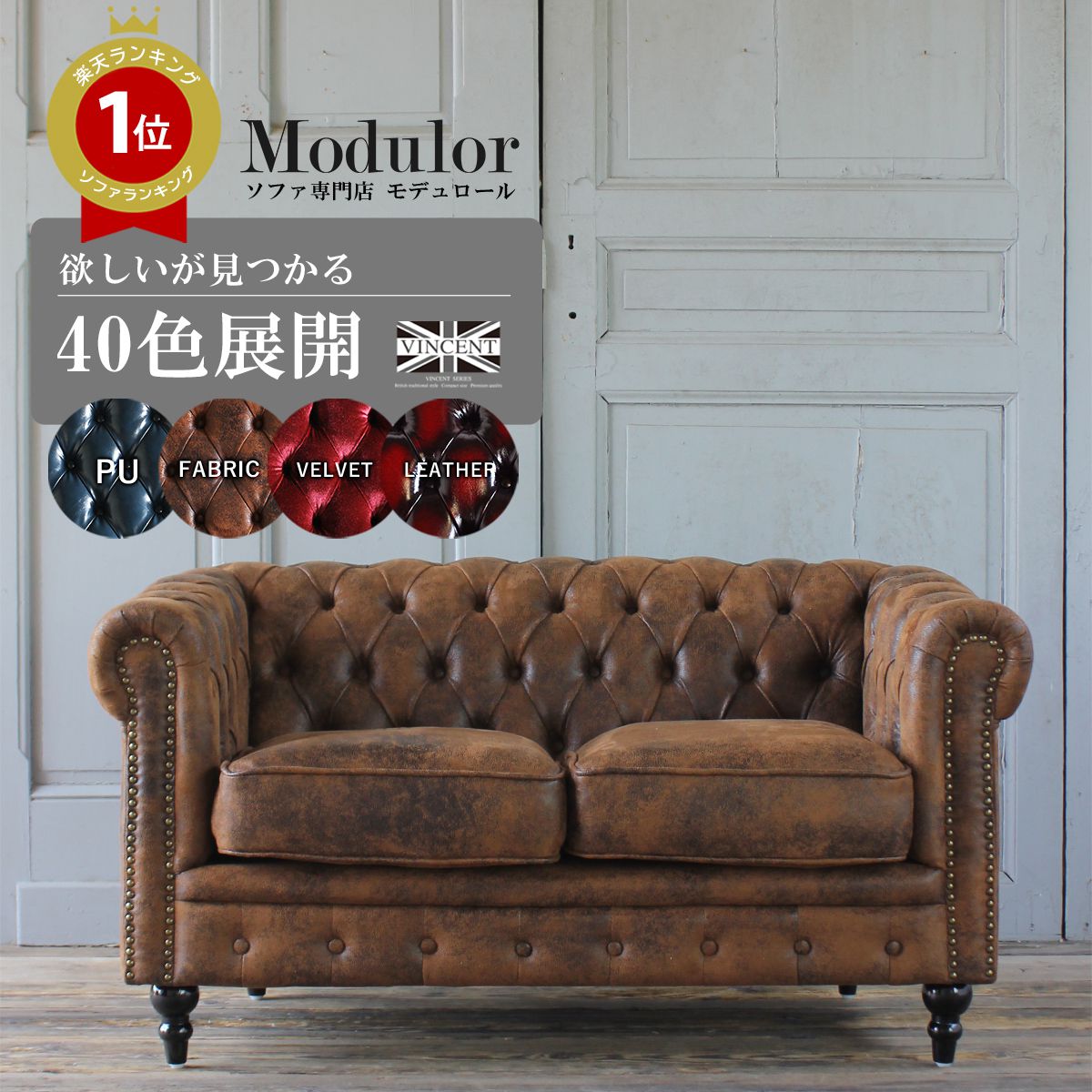 VINCENT ヴィンセント 2人掛けソファ VC2P38K アンティーク ソファ ブラウン PUレザー ソファー 合皮 2人 2人用 二人がけ コンパクト チェスターフィールド 格好いい 英国調 高級 おしゃれ イギリス インテリア