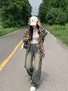 アメリカ風のハイウエストで広がるワイドレッグのヴィンテージウォッシュデニムパンツは.ゆるやかでスタイリッシュな雰囲気を醸し出す。