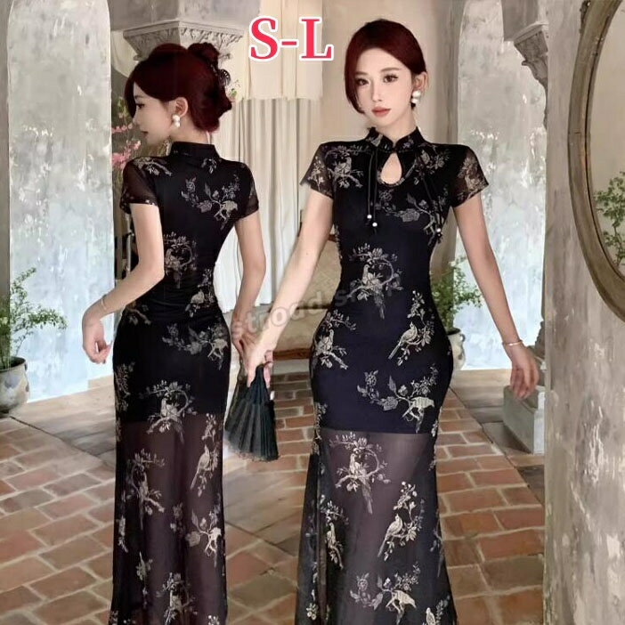 ロング丈 チャイナドレス 半袖 チュール 花柄 きれいめ 上品 おしゃれ セクシー スリット スリム ボディコンワンピース ヴィンテージ 薄手 タイトワンピース 春 夏 女性 大人 結婚式 パーティー 二次会 ステージ衣装 発表会 演奏会 普段着 エレガント
