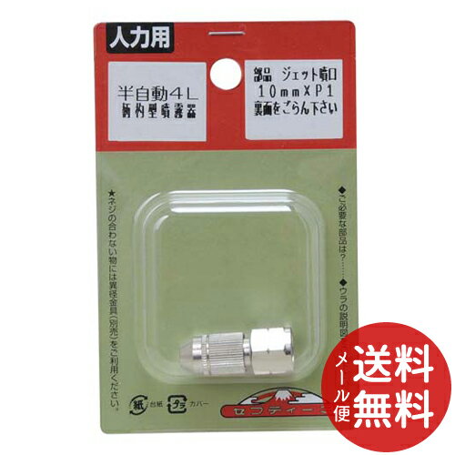 手動式噴霧器パーツです。【用途】噴霧器パーツ。【機能】ステン杓型噴霧器1.2L・半自動噴霧器4L用のジェット噴口です。霧と、遠くに出すことが可能なジェット機能が付いています。【仕様】●ネジ径:10mm×ピッチ1.0。【商品サイズ】縦(mm) 10横(mm) 10高さ(mm) 30【商品重量】重量(g) 20JANCD:4977292650854【メール便対応】その他、配送方法をお選び頂く事は出来かねます。合計金額による送料無料対象外の商品です。【銀行振込・コンビニ決済】等前払い決済予定のお客様へ当商品は弊社在庫品ではなく、メーカー在庫品です。在庫確認後に注文確認を行い、お支払いのお願いを送信させて頂きます。休業日、14:00以降のご注文の場合は翌営業日に上記手続きを行います。お時間が掛かる場合がございます。