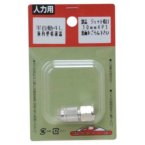 【用途】噴霧器パーツ。【機能・特徴】ステン杓型噴霧器1.2L・半自動噴霧器4L用のジェット噴口です。霧と、遠くに出すことが可能なジェット機能が付いています。【仕様】●ネジ径:10mm×ピッチ1.0。