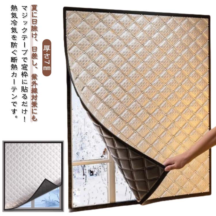 【選べる13サイズ】【冷気を防ぐ】【窓・断熱シート】窓枠に貼るだけ!冷気を防ぐ断熱カーテンです。防風、冷気遮断、中綿を充填、防音、耐摩耗性、持続可能、環境に優しい、インストールが簡単。窓枠全体をカバーできて冷気の侵入、暖気の流入を防ぎます。マジックテープ付きなので、簡単に貼り付けることができます。耐久性が優れており、長年にわたって使用できます。使い方:1.窓枠をきれいにする。2.マジックテープの剥離紙をはがして窓枠に貼る。シート本体をマジックテープに貼り付ける。貼り付け完了。 サイズ 幅80高100 幅80高120 幅90高120 幅90高150 幅100高50 幅100高80 幅100高100 幅100高120 幅100高150 幅120高80 幅120高100 幅120高120 幅120高150 サイズについての説明 サイズ:幅80cm高100cm 幅80cm高120cm 幅90cm高120cm 幅90cm高150cm 幅100cm高50cm 幅100cm高80cm 幅100cm高100cm 幅100cm高120cm 幅100cm高150cm 幅120cm高80cm 幅120cm高100cm 幅120高120 幅120cm高150cm※商品のサイズは手作業で測定させて頂いておりますので、若干の誤差があります。 素材 ポリエステル 色 写真色 備考 ●サイズ詳細等の測り方はスタッフ間で統一、徹底はしておりますが、実寸は商品によって若干の誤差(1cm~3cm )がある場合がございますので、予めご了承ください。 ●製造ロットにより、細部形状の違いや、同色でも色味に多少の誤差が生じます。 ●パッケージは改良のため予告なく仕様を変更する場合があります。 ▼商品の色は、撮影時の光や、お客様のモニターの色具合などにより、実際の商品と異なる場合がございます。あらかじめ、ご了承ください。 ▼生地の特性上、やや匂いが強く感じられるものもございます。数日のご使用や陰干しなどで気になる匂いはほとんど感じられなくなります。 ▼同じ商品でも生産時期により形やサイズ、カラーに多少の誤差が生じる場合もございます。 ▼他店舗でも在庫を共有して販売をしている為、受注後欠品となる場合もございます。予め、ご了承お願い申し上げます。 ▼出荷前に全て検品を行っておりますが、万が一商品に不具合があった場合は、お問い合わせフォームまたはメールよりご連絡頂けます様お願い申し上げます。速やかに対応致しますのでご安心ください。