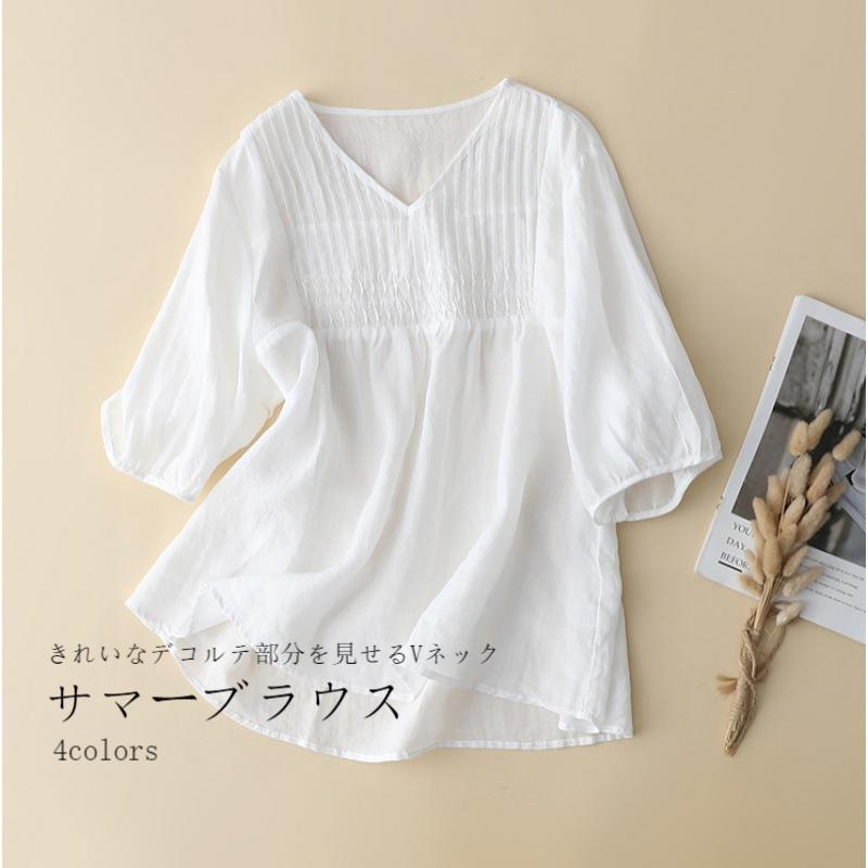 サマーブラウス Vネック レディース ギャザーブラウス 5分丈袖ブラウス ゆったり 体型カバー ブラウス プルオーバー プリーツブラウス Tシャツ カジュアルシャツ 5分丈袖 トップス 夏 春秋 20代 30代 40代 50代