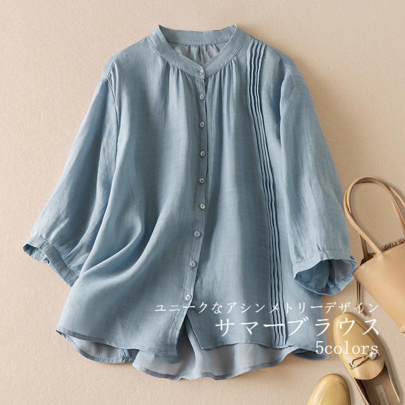 カジュアルシャツ アシンメトリー 5分丈袖 レディース サマーブラウス 5分丈袖シャツ 夏 ブラウス 前開き ゆったり トップス 春 秋 シャツ かわいい エレガント 前開きブラウス 無地 プリーツブラウス 5分丈袖ブラウス