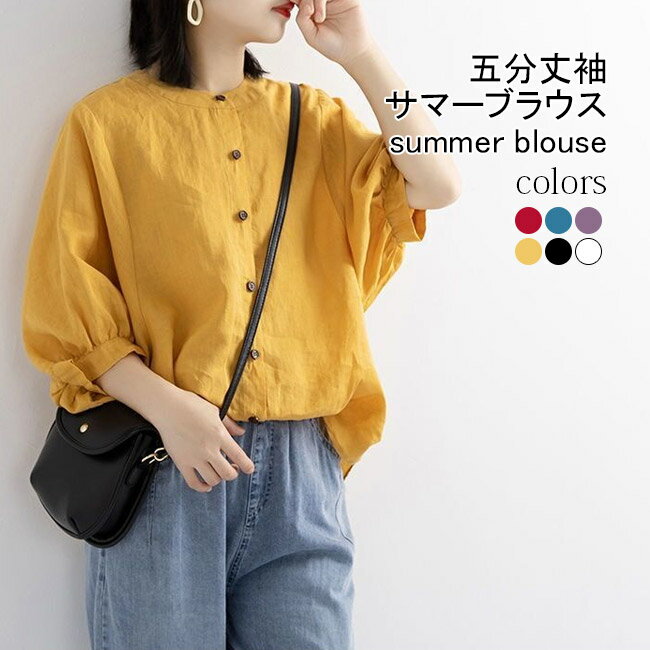 【送料無料】レディース ブラウス 半袖 40代 50代 30代 5分丈袖ブラウス 大きいサイズ ゆったり 半袖ブラウス 体型カバー 夏 無地 綿混 トップス 前開き シャツ コットン カジュアル レトロ レッド ブラック ホワイト ブルー