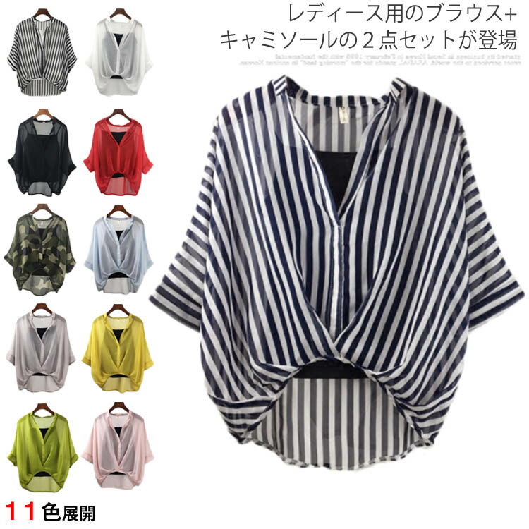 ブラウス キャミソール 2点セット レディース シフォンブラウス 透明 五分丈袖 シャツ ゆったり 女性用 トップス 春 夏 リゾート オシャレ