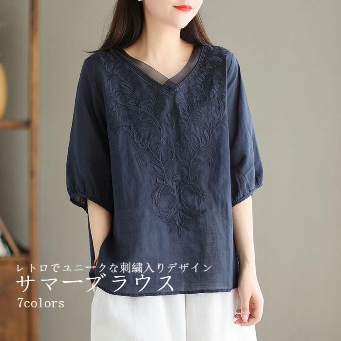 リネンブラウス 刺繍ブラウス レディース トップス 刺繍 5分丈袖 綿麻 ブラウス コットン サマーブラウス プルオーバー Vネック デコルテ見せ レトロ シャツ カジュアルシャツ Tシャツ 春夏 母の日 プレゼント 7分丈袖ブラウス