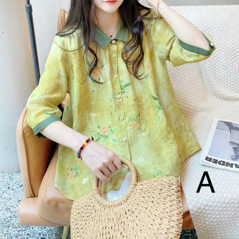 シャツ レディース 夏 レディースシャツ ブラウス ゆったり 花柄 襟付き 通勤 カジュアル 可愛い トップス 五分丈袖 グリーン イエロー S M L XL 2XL SLUA186